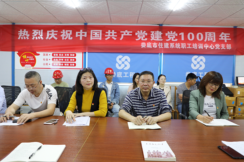 2021年5月25日下午,為慶祝中國共產黨成立100周年,婁底市住建系統培訓中心黨支部來到婁底工程建設有限公司高溪社區城中村改造工程一期EPC總承包項目部,和項目部臨時黨支部聯合開展“憶崢嶸歲月,頌百年華誕”的主題黨日活動。2個支部共有18名黨員參加,其他項目部現場管理人員和工友代表共有30多人參加活動。